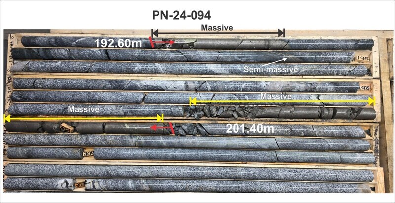 Figure 3: Massive sulphide intersections in PN-24-094. This zone was preceded by significant zones of vein, fracture controlled and disseminated Cu zones.