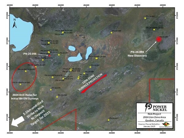 Power Nickel Inc. (TSXV: PNPN) (OTCBB: PNPNF) announced the beginning of the 2025 winter drill campaign on the Nisk project with hole PN-24-96 (Figure 1). This hole will be testing the depth extension along the trend of the Lion zone, following up on successful drilling of high-grade Cu and precious metal (Pd, Pt, Au, Ag) discovered in 2024 drill holes (See some highlights below and Table 2).