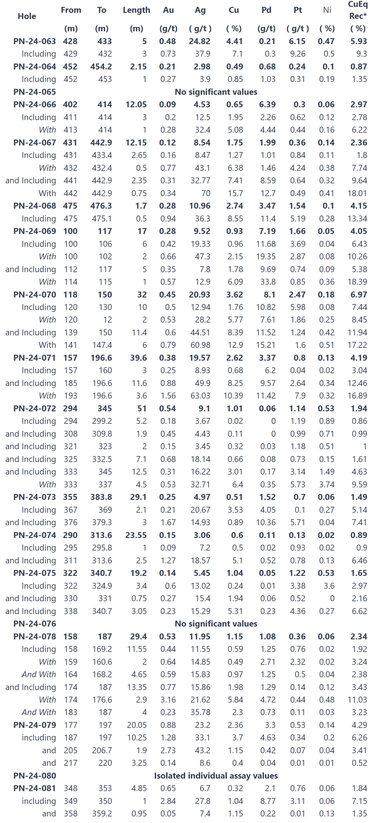 - PN-24-047 contains 14.40m of 8.15% Cu; 6.23 g/t Pd; 8.40 g/t Pt; 68.9 g/t Ag; 0.59 g/t Au; and 0.58% Ni