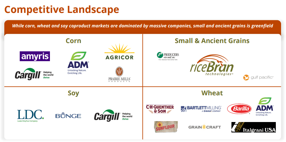 Ricebran sits in a unique greenfield area of the competitive landscape versus the other major feedstock – corn, soy and wheat. Those verticals are dominated by mega cap producers and are highly competitive with low margin structures; whereas the small and ancient grains vertical is underpenetrated and poised for higher growth rates.