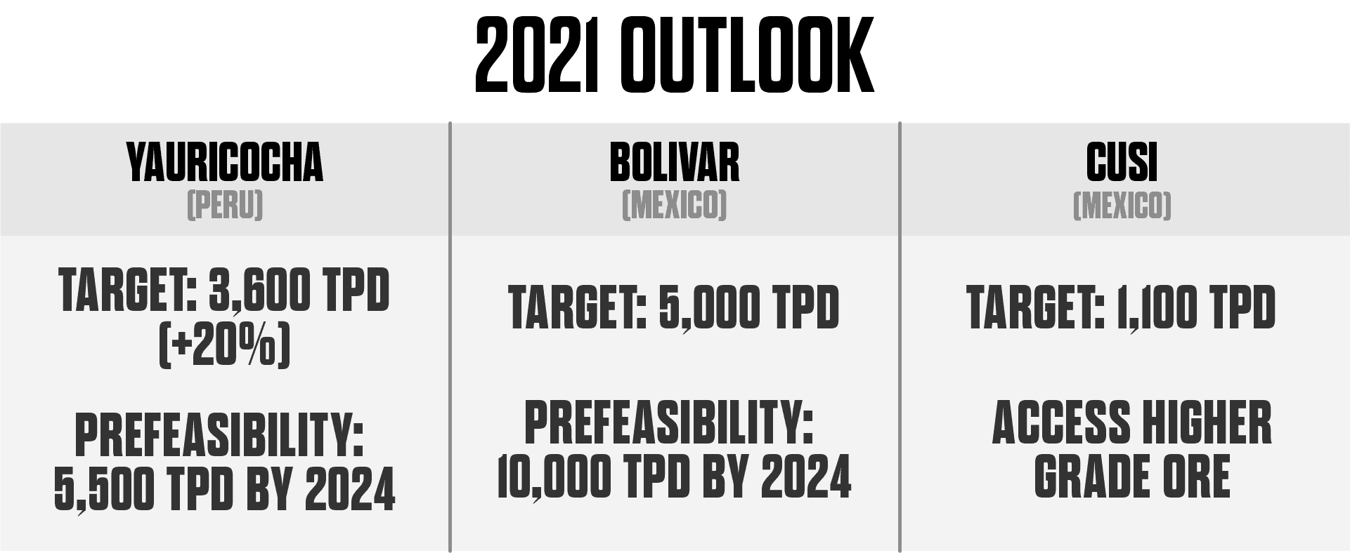 - Yauricocha Mine: Targeting a 20% increase of throughput at the Yarichocha mine to 3,600 tons per day and the completion of the prefeasibility study to expand throughput to 5,500 tons per day by 2024.