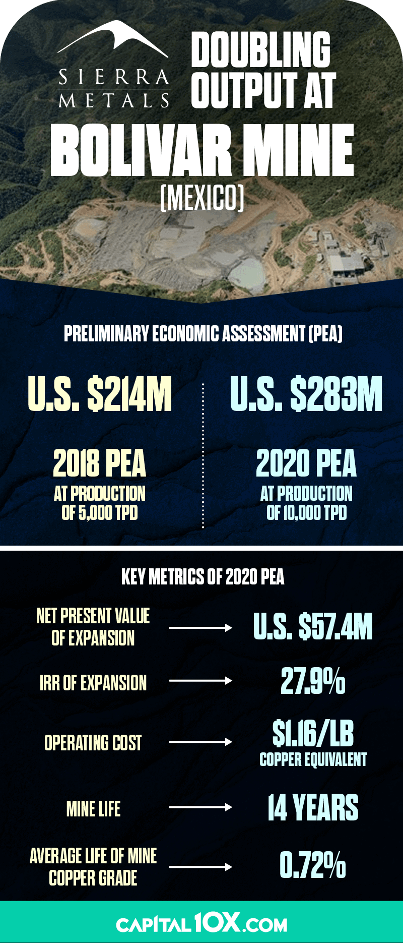 On October 20th Sierra Metals (NYSE:SMTS, TSX:SMT) announced preliminary economic assessment (PEA) results for the proposed doubling of output at the Bolivar Mine in Mexico to 10,000 tonnes per day (TPD).
