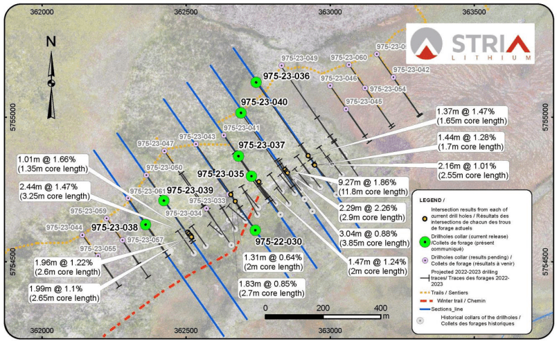 The latest assays from seven holes include up to 9.27m (true width) at 1.86% Li2O at a depth of 298m on hole 975-23-040, the best result to date from the winter drilling program and one of the top intercepts in the entire project. The completion of the drilling program paves the way for a Maiden Resource in 2023. The results confirm the potentiality of the deposit to host significantly wide and rich spodumene dykes at depth. The seven holes cited in this release, drilled in February, are mostly collared to the north-west of the deposit, drilling south-east under the previous holes.