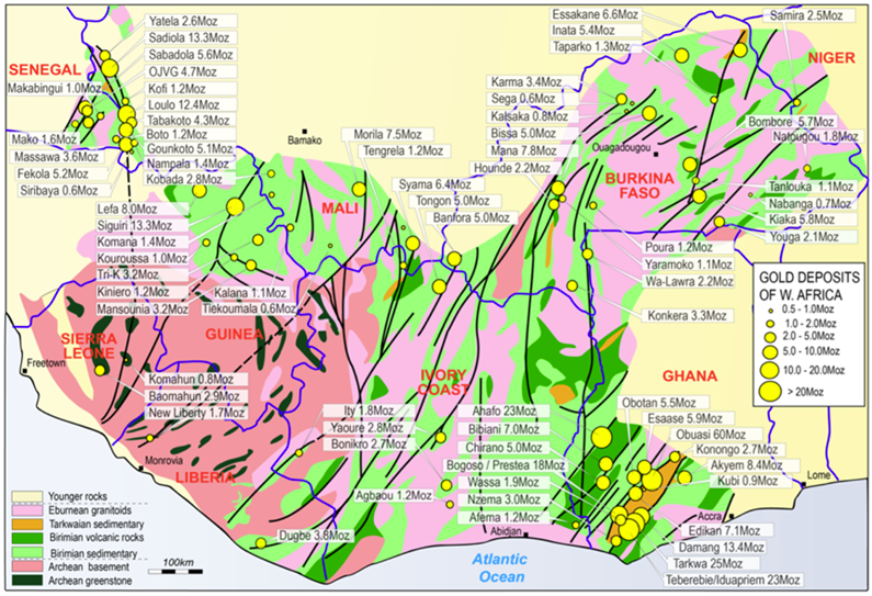 A majority of major gold deposits and most major mines in West Africa have come from Birimian Group rocks. These rocks extend north from the Gulf of Guinea through Ghana, Côte d’Ivoire, Guinea, Mali and Burkina Faso.