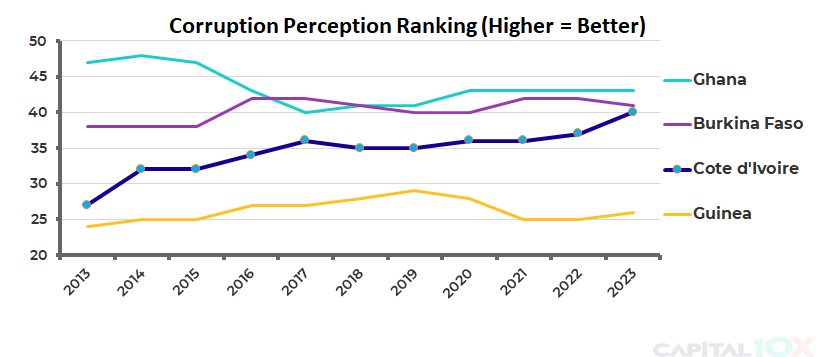 The corruption perception ranking also continues to improve while neighbors in West Africa have all seen their rankings decline or flatline.