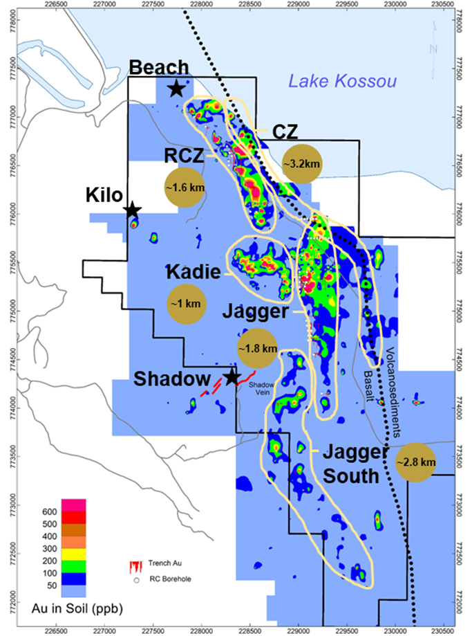 Kobo recently completed approximately 6,000 meters of drilling and more than 5,600 m trenching on three separate zones (Jagger, Zone, Road Cut Zone and Kadie Zone) returning wide intercepts grading 2 g/t Au with higher grade intercepts greater than 10 g/t Au.