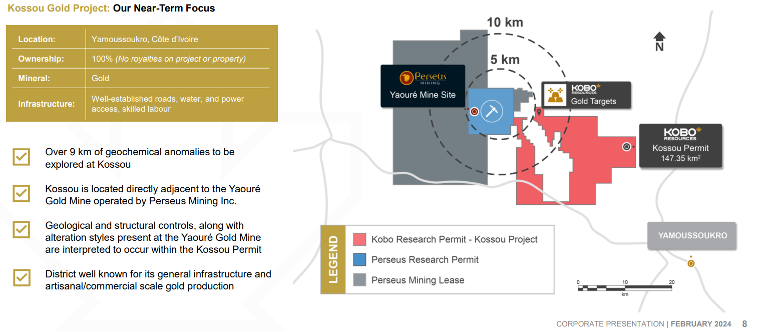 Kobo’s flagship asset, the Kossou Gold Project is located approximately 6-7 kilometers from Perseus Mining’s Yaoure Gold Mine, the largest producing mine in Côte d’Ivoire.