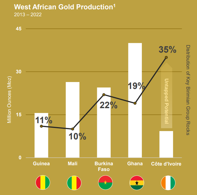 However, even though Côte d’Ivoire is home to 35% of the region’s Birimian Group rocks, the country represents only 7% of gold produced in the region over the past decade. Herein lies the opportunity.