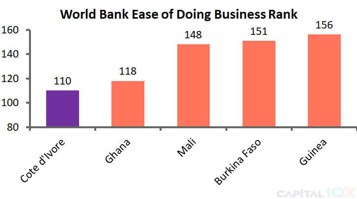 According to the World Bank, Côte d’Ivoire’s ease of doing business is the highest in the region (Lower ranking is better)