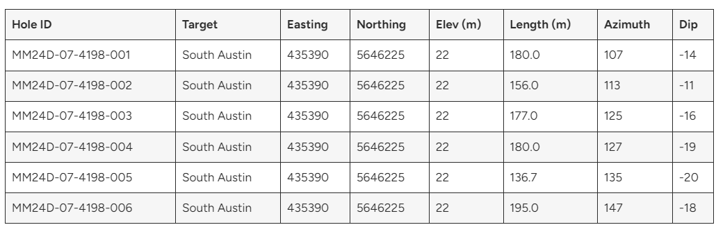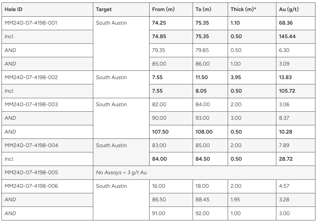 FIGURE 3. South Austin plan view drill section showing assay highlights for Holes MM24D-07-4198-001 through -006.[1]