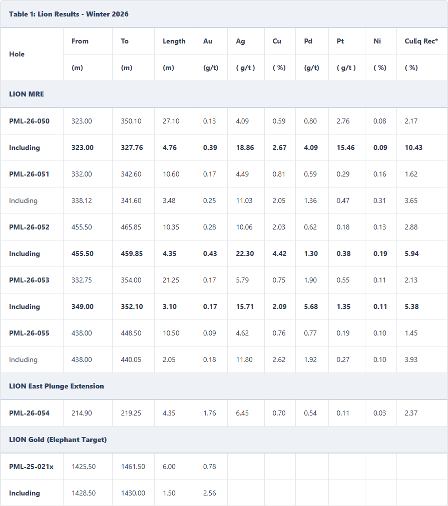 Drilling continued to define the high-grade Lion Zone in preparation for a 2026 Mineral Resource Estimate (MRE). The majority of infill drill holes in this release are for holes that are mostly defining the eastern side of the Lion zone (Figure 1) for future mineral resource estimates to an Indicated Resource classification. The 2026 winter drill campaign continues to support the modelled interpretation of the Lion Zone based on earlier wider spaced drilling and includes PML-26-050 intersected the Lion Zone and confirmed the eastern edge of the high-grade copper shoot with 4.76m @ 10.43% CuEqRec1 (Table 1).