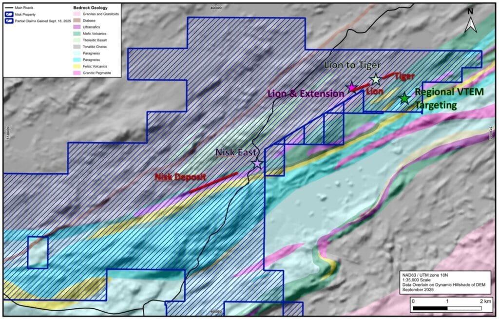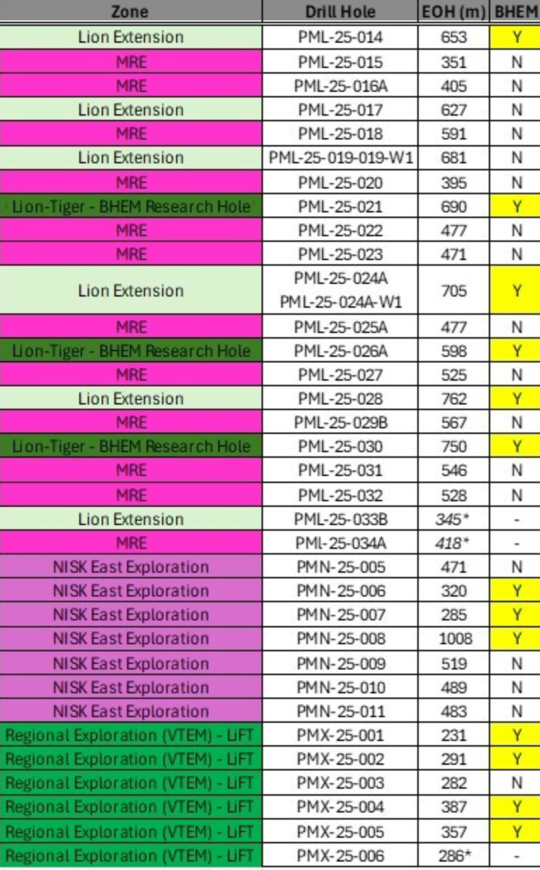Drill results from the lab has been slowed by high demand from the mining industry this summer. We are still awaiting results from holes PML-25-017 and PML-25-019 and these will be reported when results are available. The summer program has now shut down for a few weeks over the Cree moose hunt season (the “Moose Break”), and will start up again in a couple of weeks. Pending holes at Lion include up to PML-25-034a, as well as additional holes at the Nisk deposit, exploration drilling between Lion and Tiger, and six (6) exploration holes completed on VTEM anomalies.